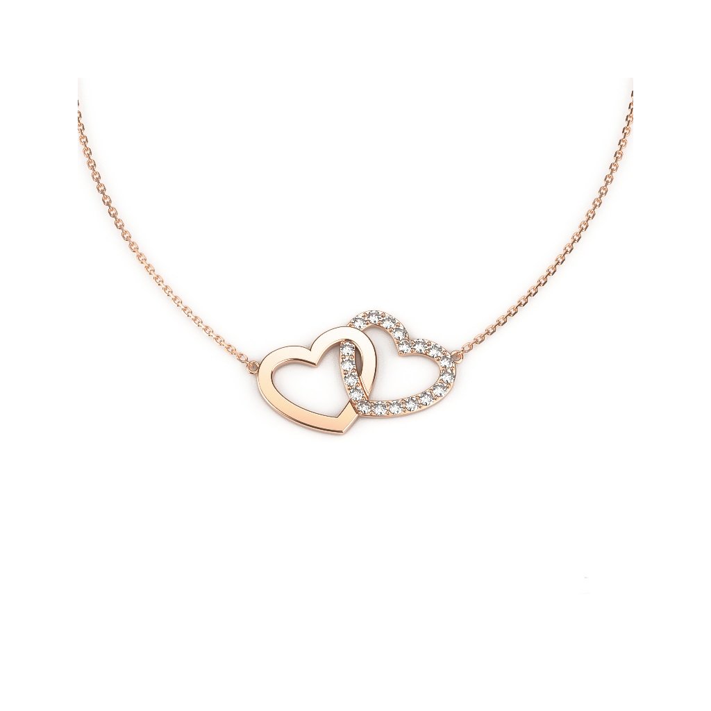 Ak hľadáte výnimočný darček, je ním táto retiazka z ružového štrnásť karátového zlata s príveskom v tvare dvoch spojených srdiečok. Srdcia sú spojené na pevno, jedno je hladké a lesklé, druhé je vykladané žiarivými briliantmi. Celebritka je v ponuke v rôznych farebných prevedeniach.