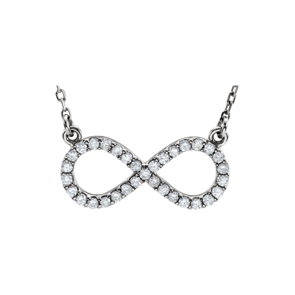 Symbol nekonečna je vyhotovený z bieleho štrnásť karátového zlata. Prívesok je zdobený diamantmi. Súčasťou produktu je aj retiazka z bieleho zlata.