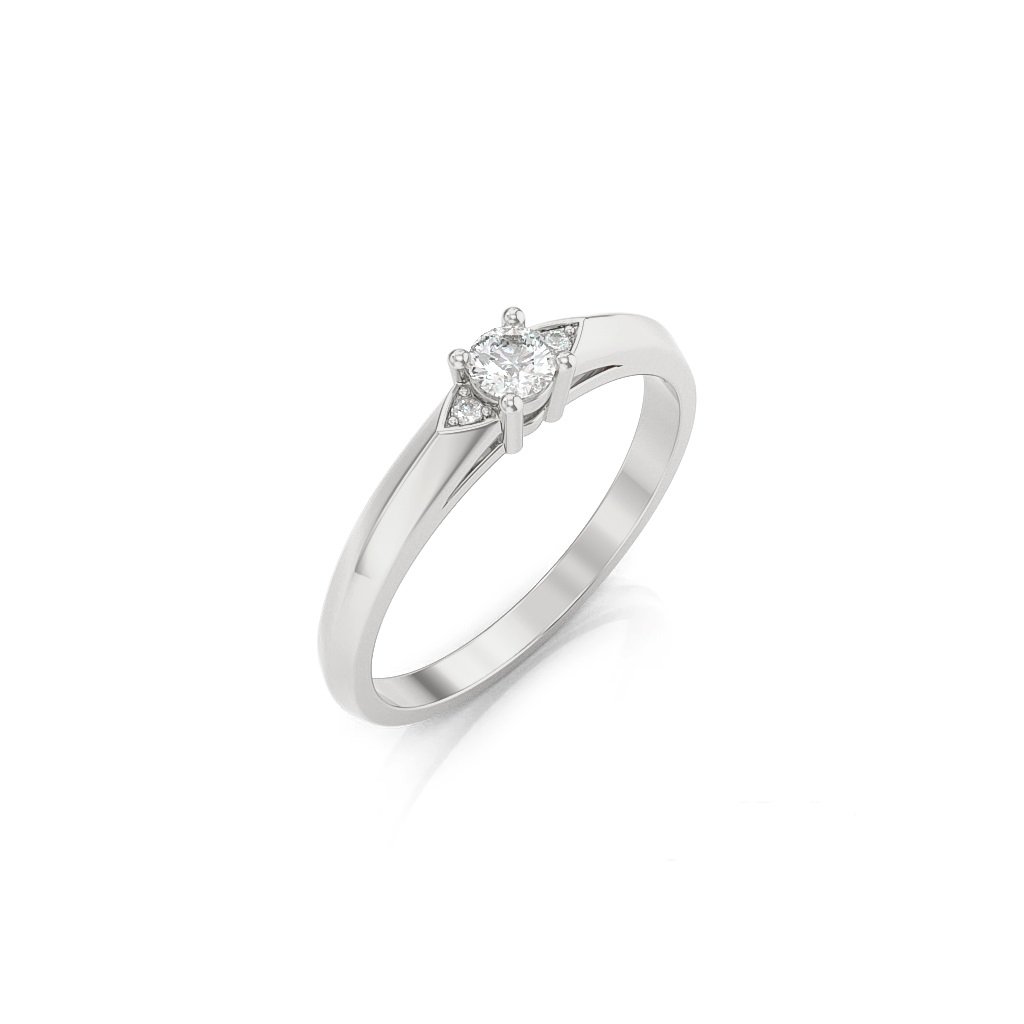 Tento diamantový zásnubný prsteň je vyrobený z ružového štrnásť karátového zlata. Hlavičku tvorí žiarivý briliant s veľkosťou 3,5 mm - 0,15 ct, ktorý je osadený v štyroch krapniach. Z každej strany je zdobený jedným menším brilianyom. Prsteň je určený pre ženy, ktoré preferujú jemnejšie šperky.