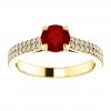 Pekný zásnubný prsteň zo žltého 14-karátového zlata. Týmto nádherným šperkom si získate srdce každej ženy. V hornej časti je osadený veľký kruhový rubín s priemerom 5,2 mm. Po jeho stranách sú na šinke prsteňa vždy v dvoch radoch umiestnené kruhové brilianty (60 ks s priemerom 1,1 mm a 4 ks s priemerom 0,8 mm, čírosť SI, farba F). Šinka má v dolnej časti prsteňa šírku 2,8 mm. Hmotnosť je 4,2 g pri veľkosti 54,5.