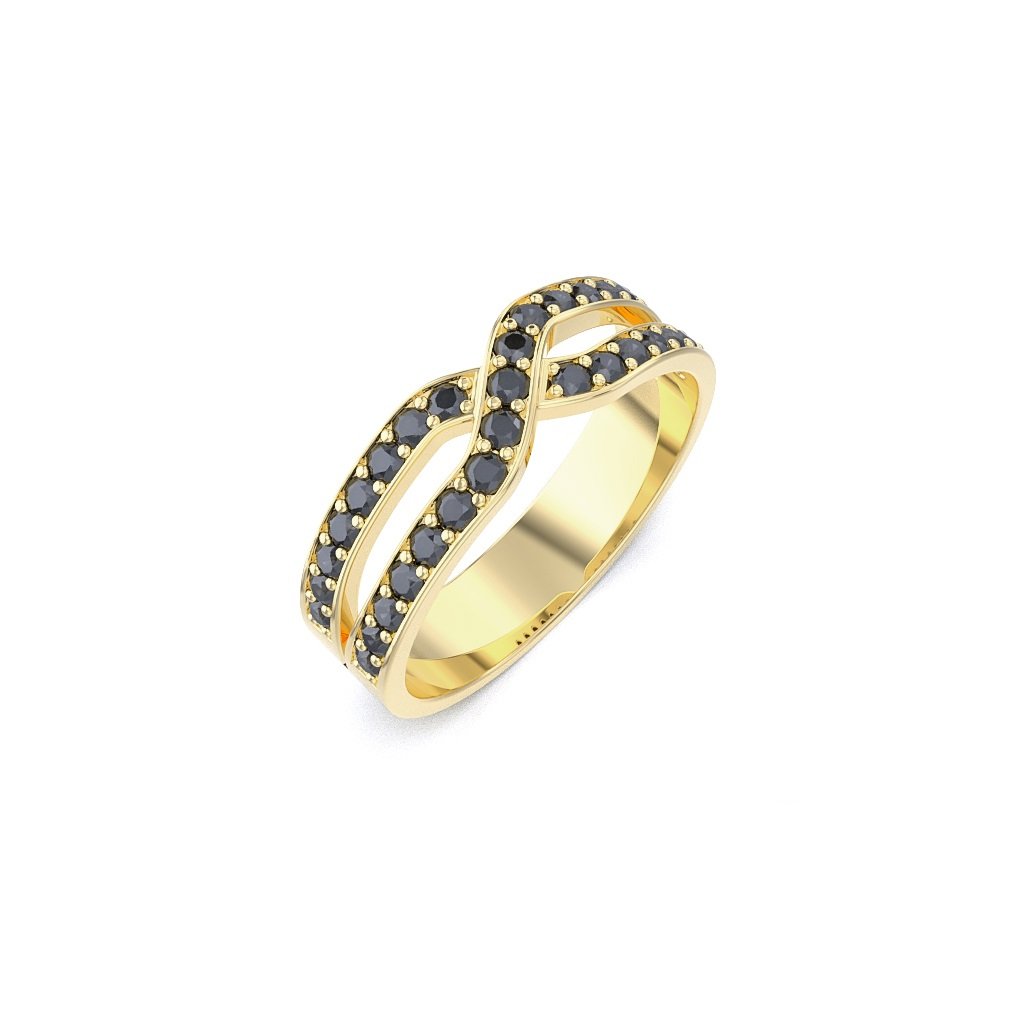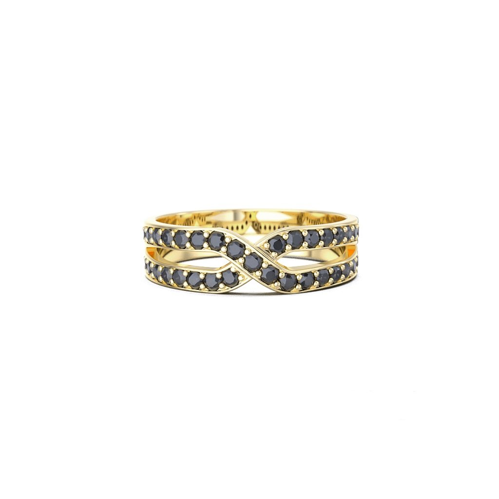 Hľadáte originálny a neopozeraný šperk? Prsteň navrhnutý našim dizajnérom si vás určite získa. V hornej časti tvoria prsteň dva pásy, ktoré sa v strede pretnú. Prsteň je vyrobený zo štrnásť karátového žltého zlata a v pohľadovej časti je bohato zdobený čiernymi diamantami, ktoré ešte podčiarkujú jeho jedinečnosť. Do vnútornej strany prsteňa je možné gravírovať venovanie, čim sa z neho stane pripomienka výnimočnej udalosti.