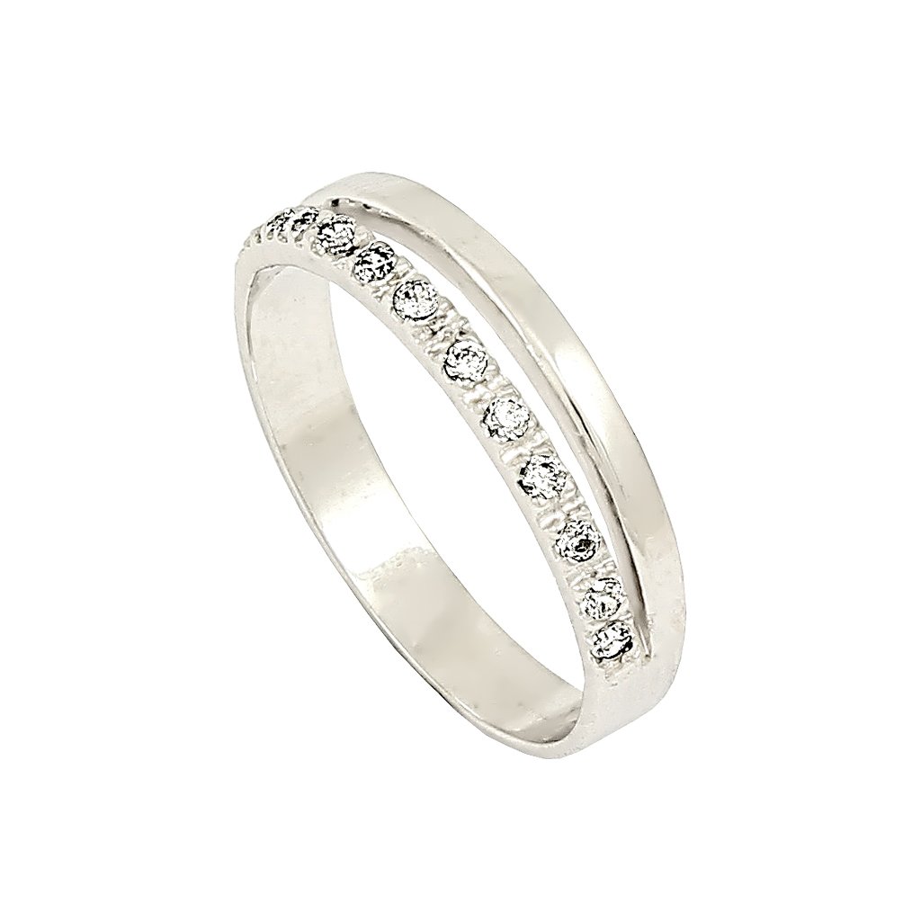 Krásny, exkluzívny prsteň z bieleho zlata má obvod v hornej časti rozdelený do dvoch šiniek, pričom jedna šinka je hladká a druhú zdobí 12 zirkónov s priemerom 1,5 mm. Prsteň má šírku 4 mm a váži 2,7 g pri veľkosti 57.