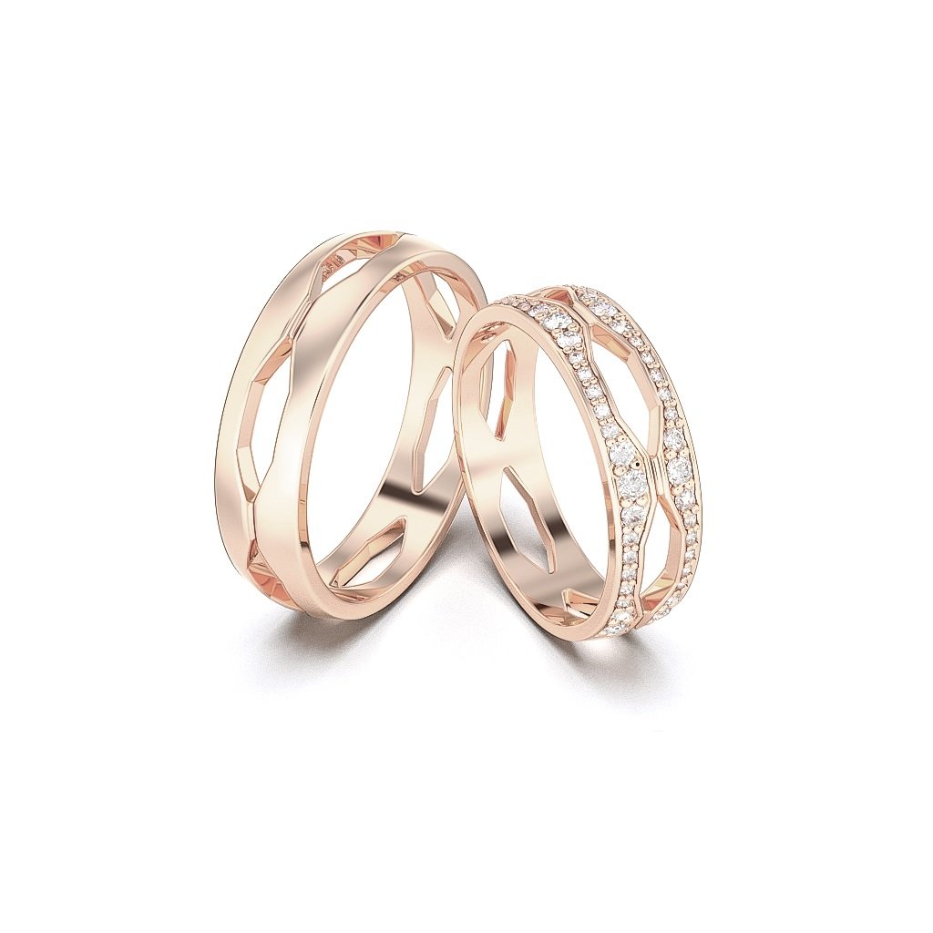Neodmysliteľnou súčasťou svadobného obradu sú obrúčky. Ak hľadáte originálne svadobné obrúčky, odporúčame vám tieto z ružového štrnásť karátového zlata. Majú plochý profil a netradičné zdobenie. Obe obrúčky sú po celom obvode zdobené šesťuholníkovými výrezmi, dámska je navyše bohato zdobená žiarivými zirkónami. Majú šírku 6 mm.