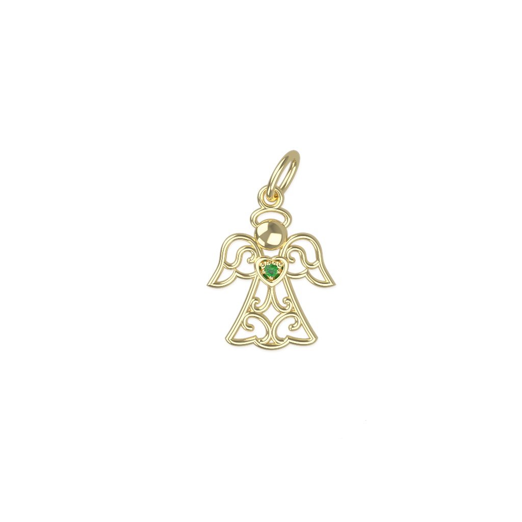 Pekný jemný prívesok v tvare anjela zo žltého zlata. Prívesok má výšku 1,20 cm a šírka 0,9 cm, silueta anjela je zdobená ornamentmi a v strede prívesku je srdiečko, v ktorom je osadený zelený zirkón. Tento prívesok je vhodný ako darček ku krstu alebo prvému svätému prijímaniu, ale rovnako sa hodí ako doplnok letného outfitu. Najlepšie vynikne na jemnej retiazke.
