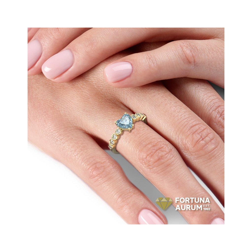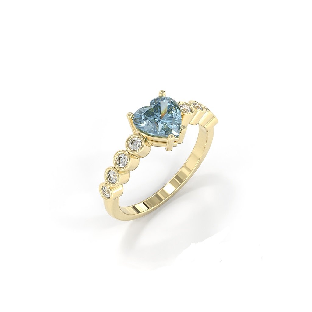Romantický dámsky prsteň je vyrobený zo žltého štrnásť karátového zlata. Dominantnou časťou prsteňa je belasý zirkón v tvare srdca. Boky prsteňa sú taktiež zdobené zirkónmi. Prsteň je možné vyrobiť aj v prevedení s briliantami alebo inými drahými kameňmi. Máme ho v ponuke v rôznych farebných prevedeniach.