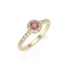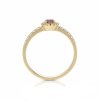 Halo dámsky prsteň je vyrobený zo štrnásť karátového žltého zlata, centrálny kameň je krásny syntetický rubín s veľkosťou 4mm, po celom jeho obvode a v pohľadovej časti šinky je osadených 18 menších zirkónov s veľkosťou 1,50 mm. S farebným kameňom môže byť použitý ako zásnubný prsteň a je rovnako vhodný ako darček na rôzne príležitosti.