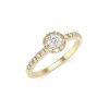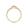 Halo zásnubný prsteň je vyrobený zo štrnásť karátového žltého zlata, centrálny kameň je žiarivý zirkón s veľkosťou 4mm, po celom jeho obvode a v pohľadovej časti šinky je osadených 18 menších zirkónov s veľkosťou 1,50 mm.