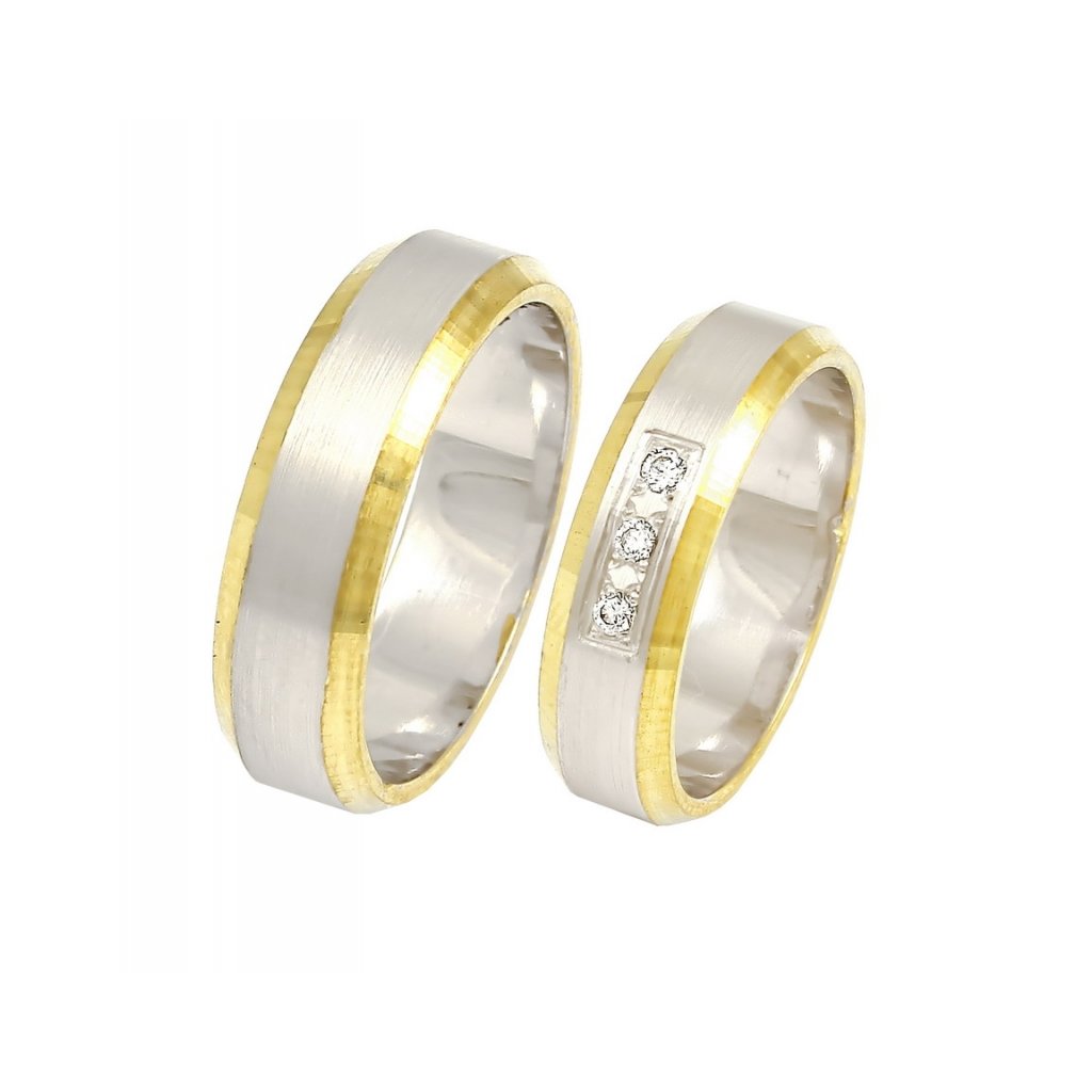 Nádherné kombinované zlaté svadobné obrúčky sú vyrobené zo žltého a bieleho zlata. Telo obrúčky je z bieleho zlata, okraje zo žltého zlata sú skosené, posaluxové. Pohľadová stredová časť obrúčky je plochá, upravená jemným pieskovaním. Dámska obrúčka je decentne dozdobená tromi zirkónmi (1,75 mm) usporiadanými v rade za sebou. Šírka obrúčky je 6 mm, orientačná hmotnosť je 10,5 g. Gravírovanie mena a dátumu je v cene obrúčok. Hmotnosť i cena obrúčok závisí od ich hmotnosti.