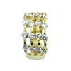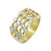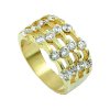 Impozantný dámsky prsteň je vyrobený zo 14 karátového žltého zlata a je zdobený zirkónmi. Šinka má v hornej časti 1,1cm a v dolnej časti šírku 5,00 mm. V hornej časti je prsteň rozdelený na 4 pruhy, pričom každý pruh je ozdobený 4 zirkónmi s priemerom 2,00 mm. Hmotnosť prsteňa je 6,5 g pri veľkosti 56.